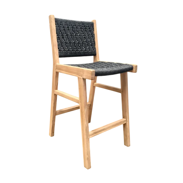 An Indonesian teak bar stool with woven rope.